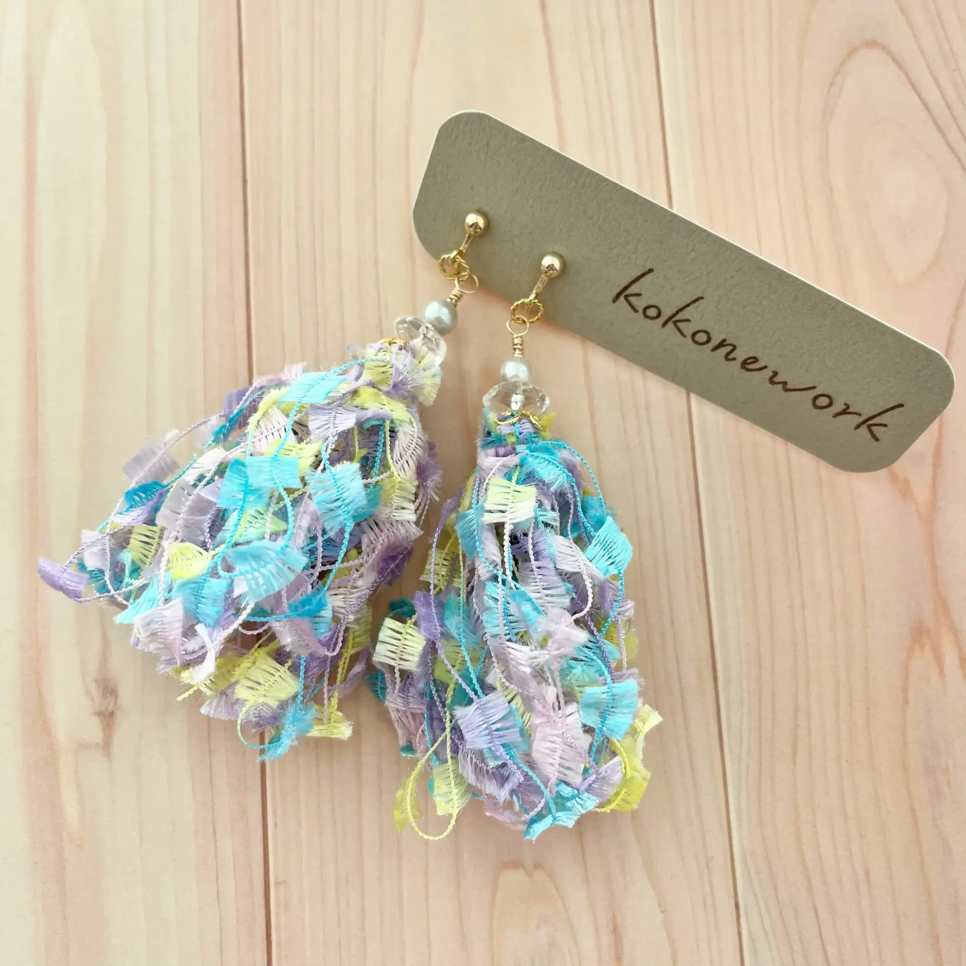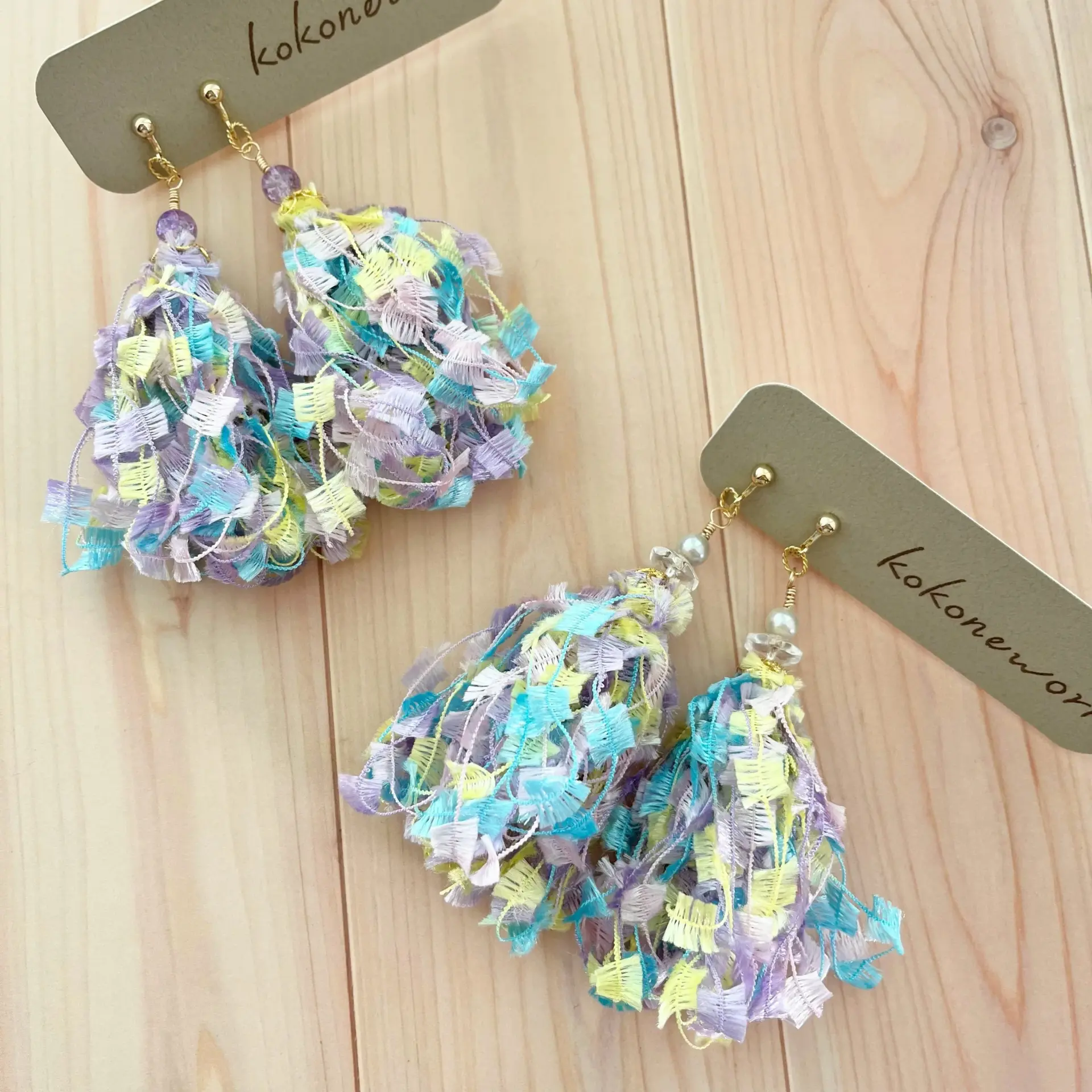 キラキラと鮮やかでかわいい引き揃え糸で作ったタッセルを耳飾りにしました。