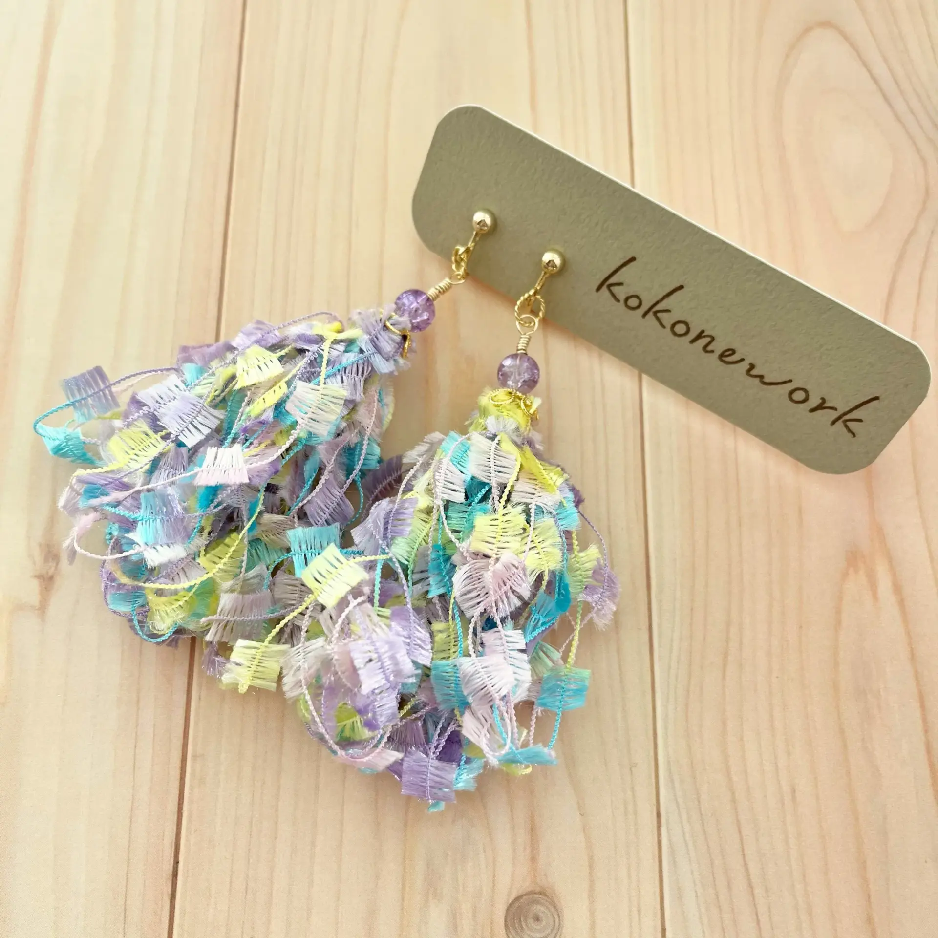 キラキラと鮮やかでかわいい引き揃え糸で作ったタッセルを耳飾りにしました。